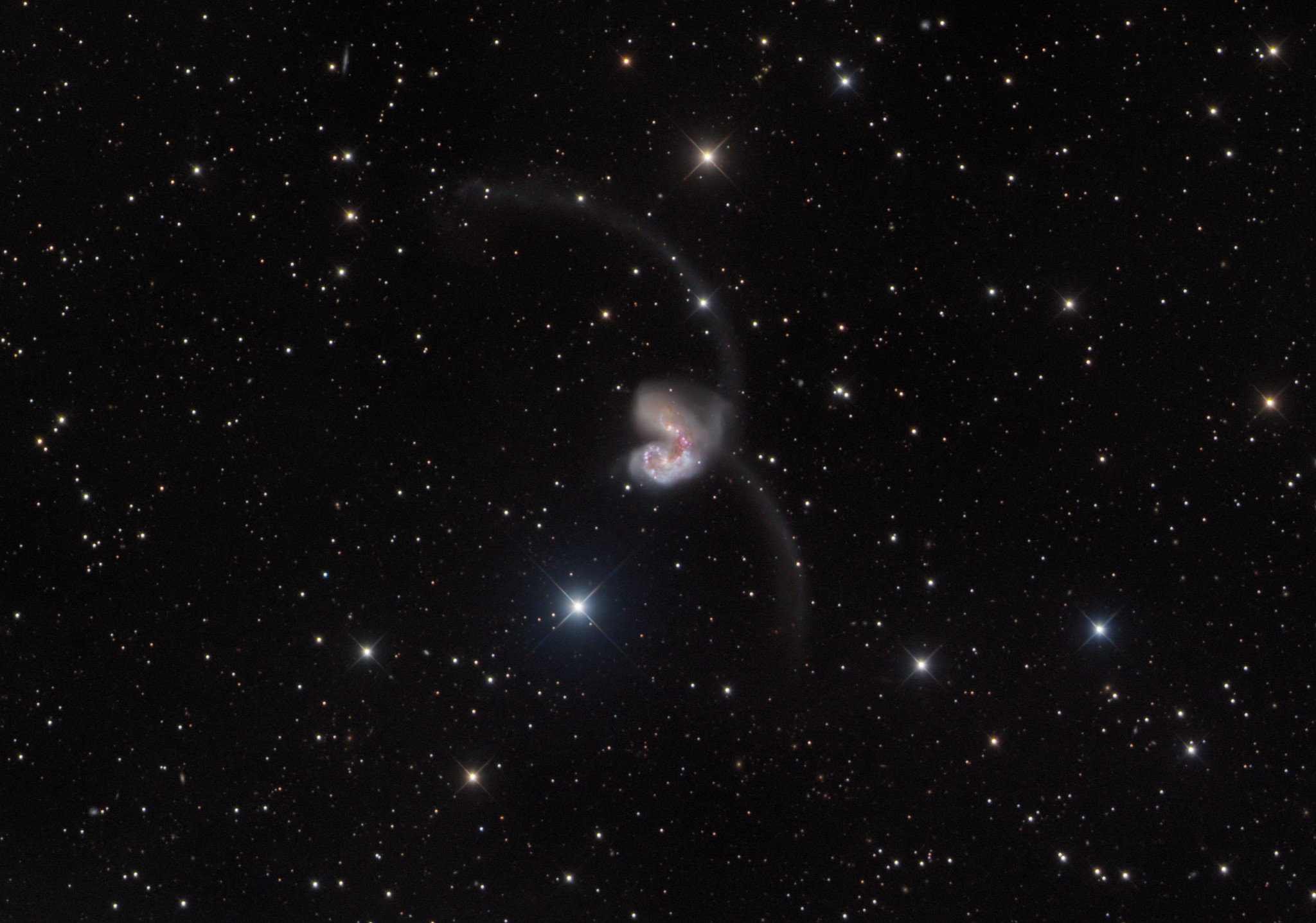 You’re actually looking at two galaxies that have collided and are not doing a very good job of social distancing. The bottom lobe is NGC 4038 and the top one is NGC 4039.