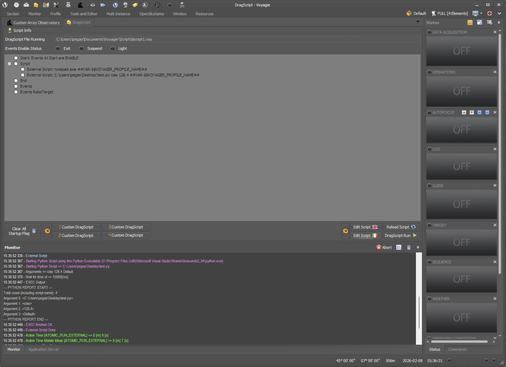 NEW => Run External Executable/Script → It is now possible to directly run Python .py scripts from the external execution action. Requires a Voyager Advanced, Array, or Full license or Plugin Developer.