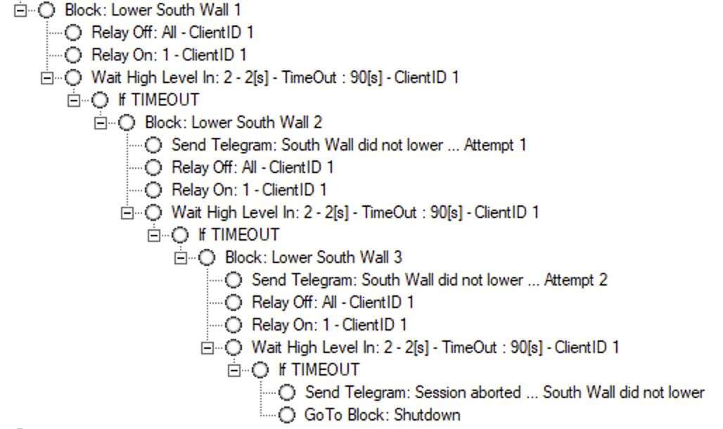 I couldn’t figure out how to use the “Repeat Block” command without causing an infinite loop, so I came up with this idea of nested blocks with a timeout as the trigger. Wall works 99% of the time but I do get the occasional freeze when one of the actuators doesn’t move in perfect sync.